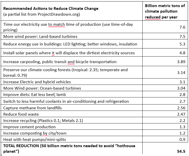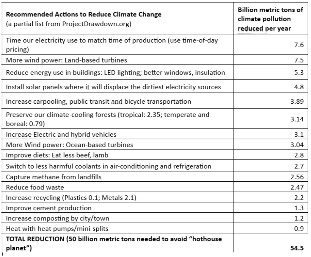 A key point is that although every person can do SOME of these actions on their own, a lot of them require COLLECTIVE action – coming together to make changes. This isn’t easy, especially now when so many people are upset with each other. Many of the solutions need leadership from business, also. It will also cost a lot of money – several trillion dollars. There are many ways to make all of this happen, one of which is carbon pricing – explained in John Kondos earlier column.
